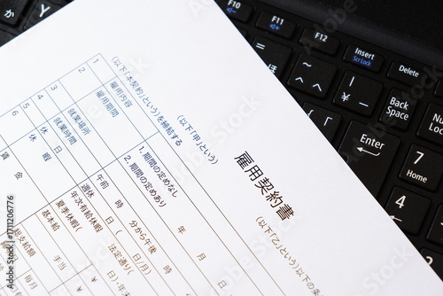 Fototapeta - 雇用契約書 - 雇用主と労働者の間で締結する、賃金や労働時間など雇用契約の内容を文書にした雇用契約書