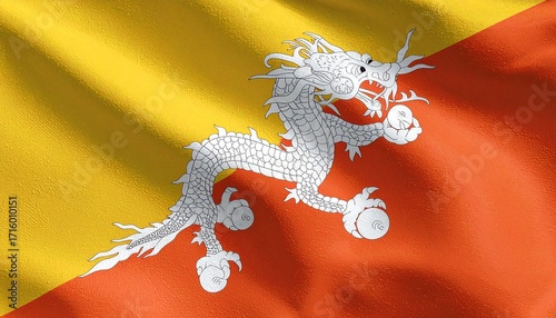 Fototapeta - Bhutan’s flag with yellow-orange diagonal split and white dragon holding jewels—symbolizing purity, protection, and the mythic choreography of spiritual and royal authority.
