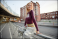 >Naklejka na meble>Portrait of Caucasian girl sitting on metal railing near urban street, smiling confidently at camera, wearing casual streetwear, city buildings and overpass in background