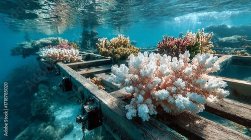 Fototapeta - Connected sensor arrays in coral reefs track bleaching events and water quality, transmitting early alerts to conservation platforms for rapid response.