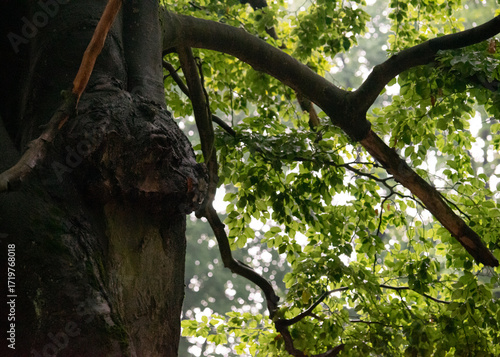 Fototapeta - Drzewo z niezwykłymi elementami – naturalny kształt przypominający głowę niedźwiedzia, czaszka sarny oraz żółty grzyb. Symboliczne połączenie dzikiej przyrody, życia i śmierci w leśnym ekosystemie