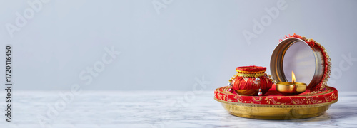 >Naklejka na meble>Karwa Chauth pooja thali with decorated sieve, diya and kalash placed on white background, traditional Hindu festival banner, copy space for festive greetings or text
