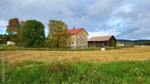 Fototapeta - A yellow wooden house stands beside a large barn on a field with ripe crops. Trees show autumn colors under a partly cloudy sky, creating a peaceful rural scene.