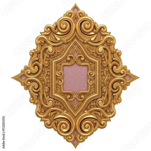 Fototapeta - Ornate golden decorative emblem design with intricate swirls and geometric center