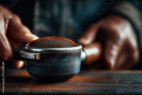 Fototapeta - Pełna miarka zmielonej kawy przed wsypaniem do ekspresu – detal przygotowania napoju