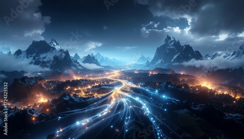 Fototapeta - Futurystyczna ilustracja przedstawiająca świecące linie w podłożu symbolizujące ścieżki jakimi przepływają informacje w wirtualnym, komputerowym świecie