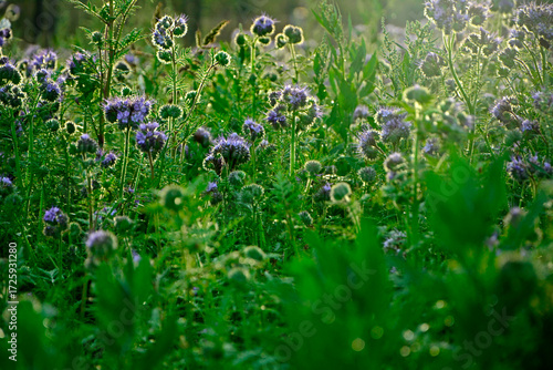 Fototapeta - pole kwitnącej faceli pokrytej rosą i oświetlonej słońcem, facelia pod słońce, niebieskie kwiaty facelii na łące, Phacelia tanacetifolia, blue phacelia flowers in the meadow, Lacy phacelia flowers