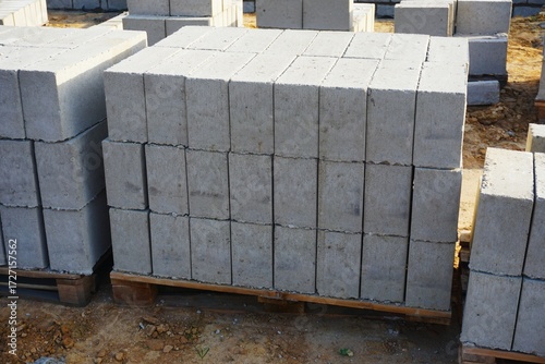 >Naklejka na meble>Drewniana paleta na budowie z ułożonymi 48 eleganckimi bloczkami do budowy domu. W tle widać plac budowy i kolejne stosy bloczków, gotowe do użycia.