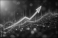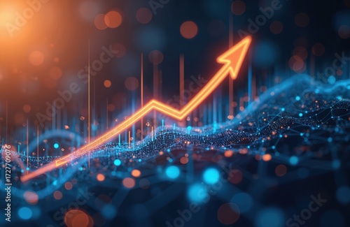 Fototapeta - Glowing orange arrow graph shows upward trend on abstract digital network background. Data analytics chart displays positive growth in cyber space. Futuristic technology concept illustration.