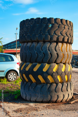 Fototapeta - Wysoki stos zużytych potężnych opon leży na zakurzonym podwórku przemysłowym. W pobliżu zaparkowany jest jasnoniebieski samochódo z małą oponą oświetlony promieniami słońca.