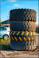 >Naklejka na meble>Wysoki stos zużytych potężnych opon leży na zakurzonym podwórku przemysłowym. W pobliżu zaparkowany jest jasnoniebieski samochódo z małą oponą oświetlony promieniami słońca.
