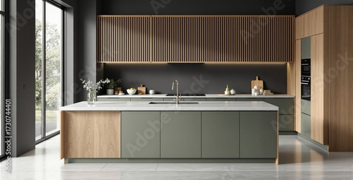 Fototapeta - Modern minimalist kitchen interior with olive green cabinets, wood accents, and large windows in natural daylight concept design space.. Ai generative