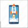 Wprowadzenie nowej aplikacji mobilnej na rynek. Rakieta startująca ze smartfona jako symbol sukcesu i rozwoju startupu.