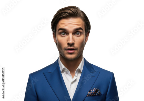 >Naklejka na meble>Surprised man in blue suit portrait with wide eyes, shocked expression, handsome model, business professional, isolated on transparent background