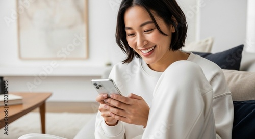Fototapeta - リビングにてスウェットのセットアップ姿でスマホを操作する、休日の日本人女性