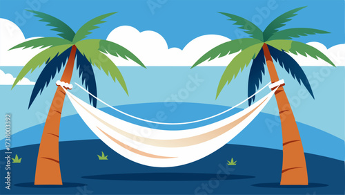 Fototapeta - A hammock strung between two palm trees with gauzy curtains billowing in the tropical breeze.