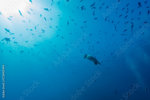 Fototapeta - A sea turtle swims through the ocean surrounded by schools of fish, likely searching for food or migrating to a new location.
