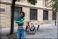 Fototapeta - Young woman smiling with folded arms near a shared bicycle in the city