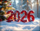 Trójwymiarowy, czerwony napis 2026 na śniegu obok choinki. Sylwester, Nowy Rok