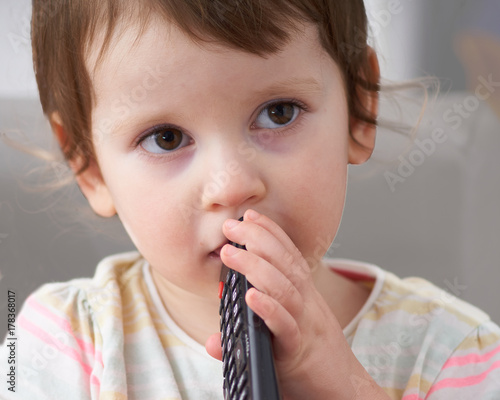 Fototapeta - Dziewczynka bawi się pilotem od telewizora, wkłada go do buzi.
