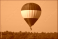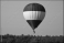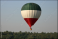 Balon na rozgrzane powietrze, w pasy zielony, biały i czerwony, w powietrzu, ponad drzewami