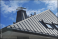 Modernes Stehfalz-Metalldach mit Dachfenster, Schneefang, Dachrinne, Dunstabzügen und mit Metall verkleidetem Schornstein