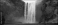 A waterfall cascades through the overcast sky, peaceful, misty, serene