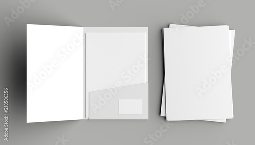 A4 size single pocket reinforced folder with business card mock up isolated on gray background. 3D illustration