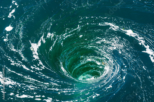 Fototapeta - High angle view of a powerful whirlpool at the surface of green water with foam.