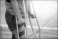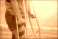 Disabled woman with crutches or walking stick or knee support standing in back side,half body.