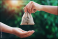 Fototapeta - hand giving money bag to another people on green background with sunrise