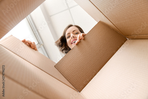 Fototapeta - Young woman opening parcel at home, view from inside of box