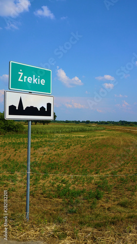 Fototapeta - Znak drogowy w Europie na tle nieba i łąk z drzewami