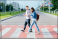 Fototapeta - A picture of a happy young family on a walk on a day off. A happy family crosses the road at a pedestrian crossing