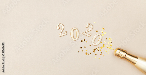 Creative Christmas and New Year greeting card with golden champagne bottle, confetti stars and 2020 numbers. Flat lay. Banner format.
