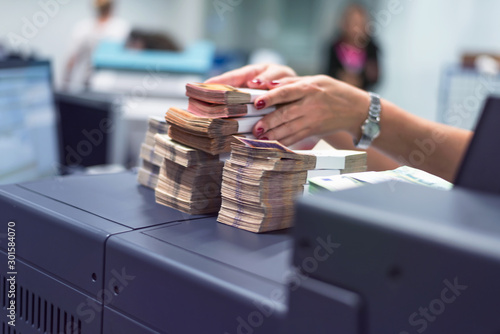 Fototapeta - Bank employees sorting and counting money inside bank vault. Large amounts of money in the bank.