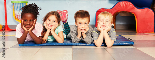 Fototapeta - Glückliche Kinder beim Kinderturnen in Sporthalle