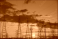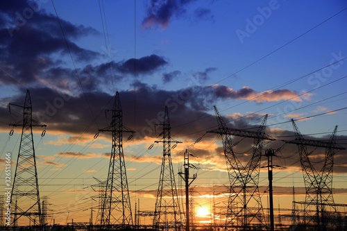 Słupy wysokiego napięcia, przesył energi, piękny złoty zachód słońca.