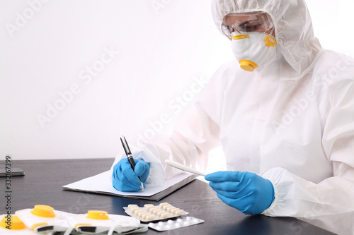 Fototapeta - Kobieta w kombinezonie ochronnym wypisuje receptę