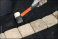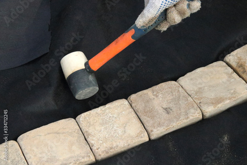 >Naklejka na meble>Worker's hand adjusting sandstone edging with a rubber mallet on the laid woven geotextile fabric in the summer garden under reconstruction