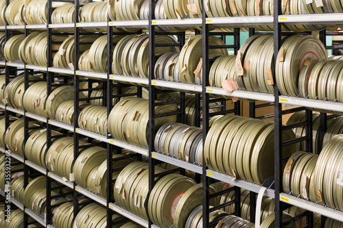 Fototapeta - Film canisters on a shelve in a film archive.