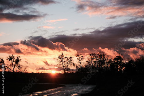 Sunset clouds after the rain over field with puddles