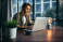 Young woman working with a laptop. Female freelancer connecting to internet via computer. Businesswoman at work