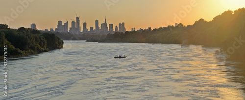Golden sunlight reflects on tranquil river water under an expansive sky