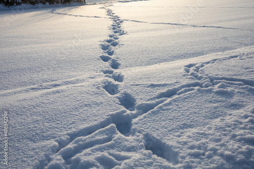 Fototapeta - Ślady na śniegu z przebijającym blaskiem słońca
