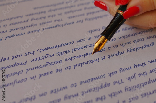Fototapeta - Czerwone paznokcie przed pielęgnacją. Zbliżenie na dłoń podczas pisania listu. Czerwone elementy dłoni na zbliżeniu.
