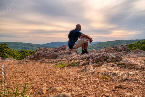 Fototapeta - Man enjoying the view at the top of a mountain during a hike of Taum Sauk Mountian, the highest elevation point in Missouri.