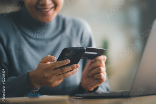 >Naklejka na meble>woman makes a purchase on the Internet on the smart phone with credit card, online payment, shopping online, e-commerce, internet banking, spending money
