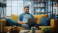 Fototapeta - Handsome Caucasian Man Working on Laptop Computer while Sitting on a Sofa Couch in Stylish Cozy Living Room. Freelancer Working From Home. Browsing Internet, Using Social Networks, Having Fun.