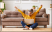 Fototapeta - Overjoyed african american female in headphones sitting on floor and celebrating success while working remotely or studying online